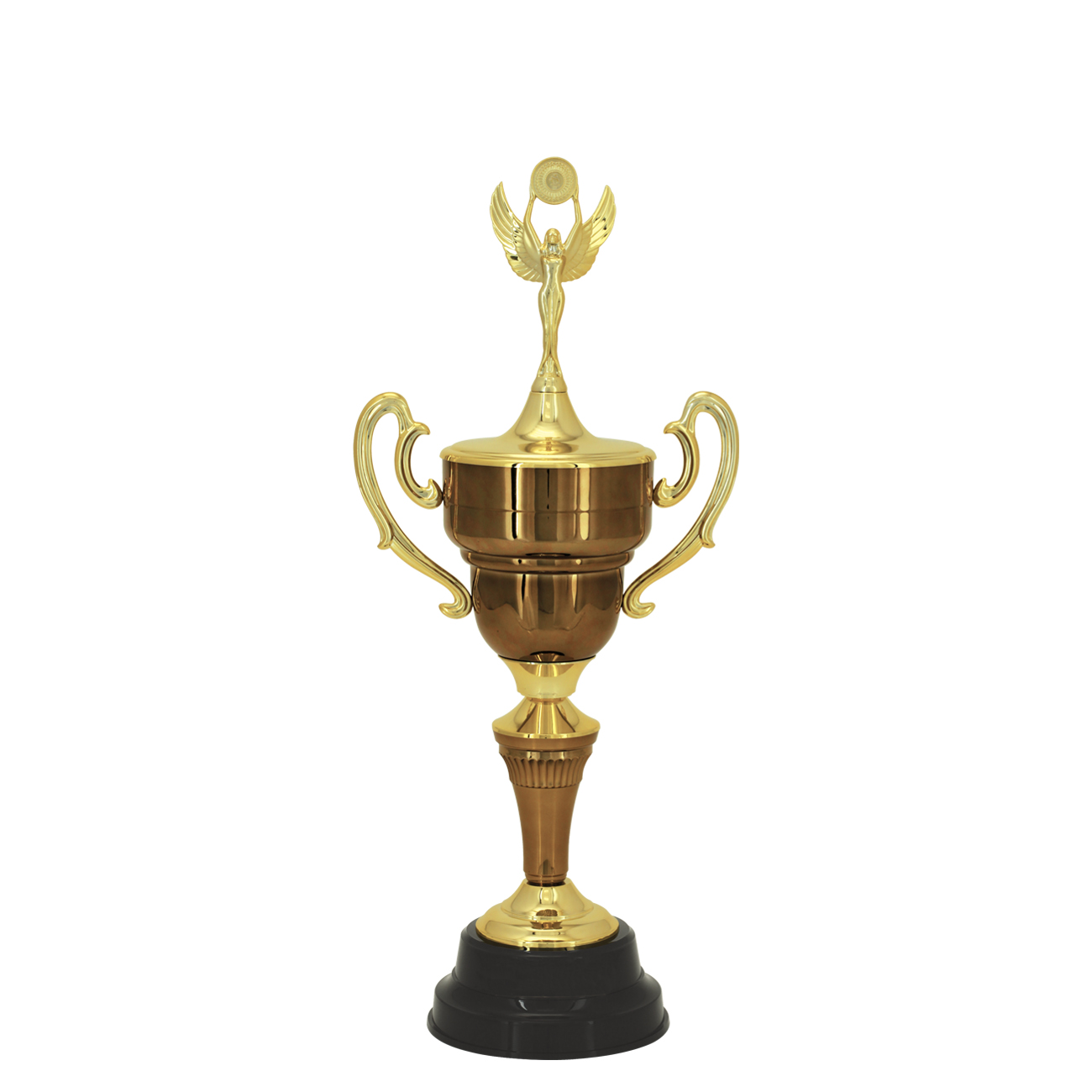TROFÉU EM POLÍMERO METALIZADO A ALTO VÁCUO MEDIDAS: ALTURA – 73 cm. LARGURA SUPERIOR – 33 cm. LARGURA INFERIOR – 20,80 cm. ALTURA DA BASE- 8,50 cm. PESO APROXIMADO – 1,80 KG CORES- DOURADO, BRONZE, PRETO. CORES ALTERNATIVAS: TAÇA E CONE NAS CORES DOURADA OU PRATA. COMPOSIÇÃO: COMPONENTES FABRICADOS EM POLÍMERO: BASE REDONDA, SUPORTES, CONE, TAMPA, TAÇA COM ALÇA E TAMPA E ESTATUETA SUPERIOR. OUTROS COMPONENTES: FERRAGENS PARA FIXAÇÃO.